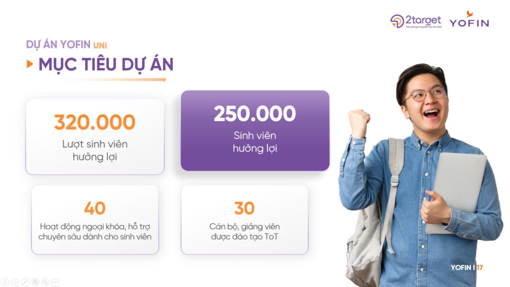 Dự án YOFIN là một phần nằm trong chương trình thực hiện sứ mệnh mà 2Target theo đuổi. Mục tiêu của chúng tôi khi xây dựng dự án là mang đến một thế hệ lao động trẻ có đủ kỹ năng để theo đuổi các mục tiêu tài chính cá nhân, từ đó góp phần vào sự phát triển bền vững của đất nước. Đồng thời, 2Target hy vọng sẽ truyền cảm hứng và kêu gọi sự hợp tác từ các tổ chức cộng đồng, đơn vị đào tạo và tổ chức sử dụng lao động, nguy giảm thiểu khó khăn cho sinh viên trong công việc tiếp theo kiến trúc công thức và tăng cường động lực trong quá trình hướng tới sự độc lập của tài chính.